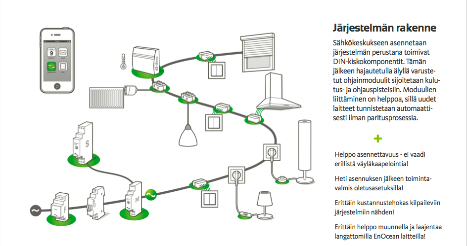 ![]() | Smartecno järjestelmä OSAA ENEMMÄNKYTKENTÄMODUULIT Hämmästyttävää, mitä kaikkea tämä huomaamaton elektroninen komponentti voi tehdä. Tämä High-tech-tuote muuntaa yksittäiset sähkölaitteet auttajien ryhmäksi, jotka tekevät elämästäsi mahdollisimman mukavaa. Kirkkaat värit selkeyttävät asennusta ja korostavat Smartecno järjestelmän käytettävyyttä. Kaikki pyörii alusta alkaen asukkaiden tarpeiden ehdoilla. TOIMINNOT - KYTKIN Smartecno järjestelmällä voidaan yhdistää erilaisia sähkölaitetyyppejä yhteen tilanteeseen: TV päälle, kaihtimet alas, valaistuksen himmennys. MITTAUS Smartecno järjestelmällä voidaan himmentää ja yhdistää lähes kaikenlaisia valaisimia. Ne voivat luoda loistavia valaistustilanteita vain yhdellä painalluksella. ENNALTA-AJATELTU Smartecno järjestelmässä sinulla on käytetävissäsi monia uusia sovelluksia, koska jokainen komponentti on itsessään älykäs. Kytkentämoduuli tunnistaa virrankulutuksen muuttuneen ja voi siksi ilmoittaa, että vedenkeitin on nyt valmis tai himmentää valaistuksen kun TV alkaa kuluttaa energiaa päälle kytkettäessä. KÄYTÖSSÄ Smartecno järjestelmä on yksinkertainen, älykäs automaatioverkko kodin sähköjärjestelmään. Tämä mahdollistaa täysin uusia toimintoja valaistuksen, turvallisuuden ja energian hallintaan. Valaisimet voidaan kytkeä tai himmentää erilaisiin valaistustilanteisiin joko erikseen tai yhdessä. Riippumatta kytkimen tai lampun tyypistä. Kuunteletko musiikkia kuulokkeilla? Imuroitko tai kuivaatko hiuksiasi? Ovikelloa soittava vieras ei enää jää huomaamatta, koska järjestelmä sammuttaa imurin hetkeksi ja vilkuttaa valoja, kun ovikello soi. Voit myös vain yhtä kytkintä painamalla sammuttaa poistuessasi talon kaikki laitteet, joita ei tarvita poissa ollessasi. Koko järjestelmän toiminta perustuu olemassa olevaan kotisi 230V sähköverkkoon - lisäasennuksia ei tarvita. Kotisi on jo puoliksi älykoti - Smartecno järjestelmällä täydennät sen. |