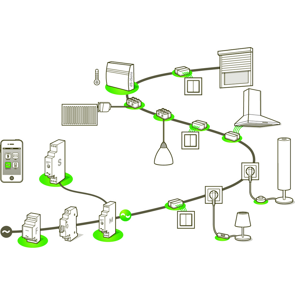 Keskusohjattu - hajautettu älykkyysJärjestelmän perusfilosofia: sähköverkosta tulee kaksisuuntainen data- ja ohjausverkko kaikille kytketyille sähkölaitteille. Tieto siirtyy nopeasti älykkäiden kytkentämoduulien, painikkeiden, valojen, laitteiden ja digitalSTROM-palvelimen välillä. Palvelin on linkki Internetiin; se on asennettu DIN-kiskoon sähkökeskuksessa. Se on Linux-pohjainen, energiatehokas tietokone, jossa palvelimen sovellukset toimivat ja asetukset tallennetaan ja se on yhteydessä Internetiin paikallisen reitittimen kautta. Tiedonsiirto liitinmoduulien kanssa tapahtuu digitalSTROM-mittarien kautta, yksi kutakin huonetta tai virtapiiriä kohti. Tämä tarkoittaa luotettavuutta – yksittäisen sulakkeen toiminta ei vaikuta koko järjestelmän toimintaan. Huonekohtaisuus helpottaa lisäksi toimintatilojen ja automaation asetusten tekemistä. |